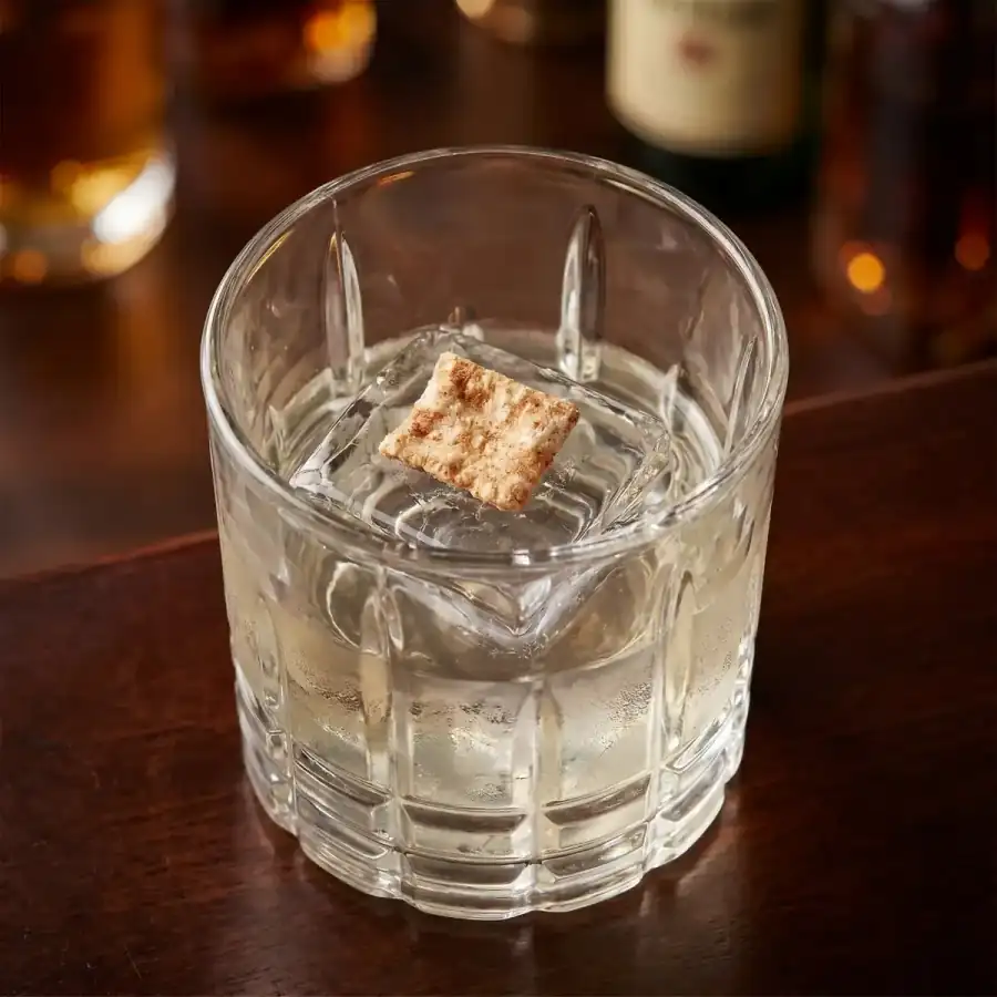 קוביית קרח גדולה וצלולה שומרת על האשליה — הדרינק נראה בדיוק כמו מים עד הלגימה הראשונה.