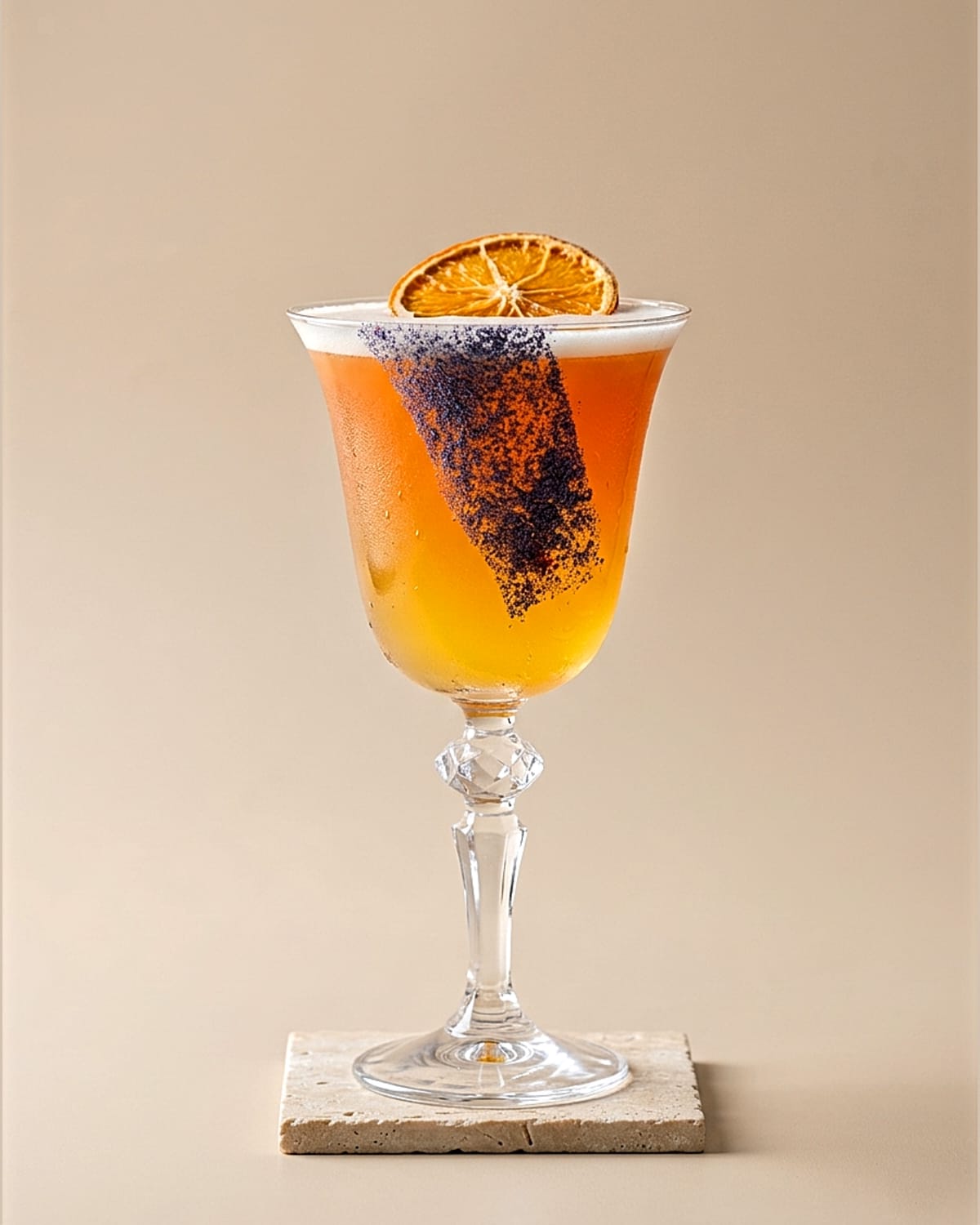 מקשטים עם תפוז מיובש ופס של אבקת פרפר כחול על דפנת הכוס.